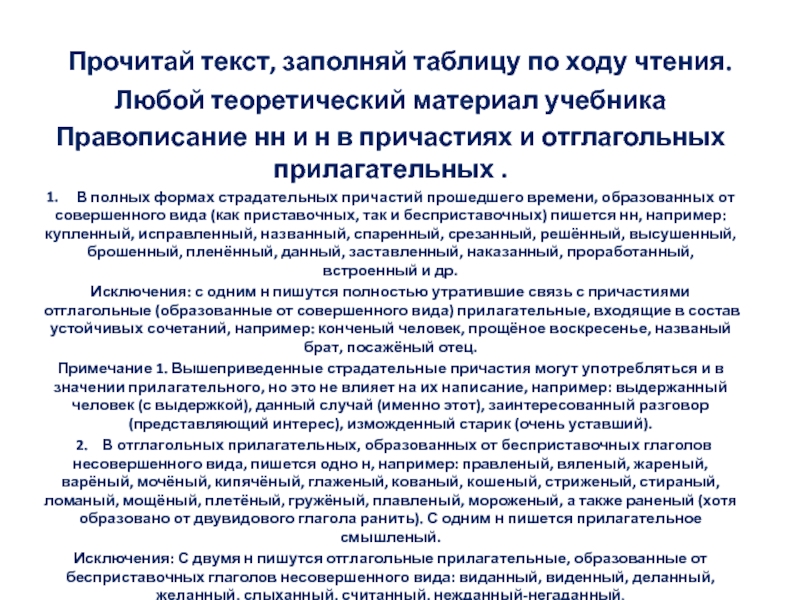 Примечание 1. Вышеприведенные страдательные причастия могут употребляться и в значении прилагательного, но это не влияет на их написание, например: выдержанный человек (с выдержкой), данный случай (именно этот), заинтересованный разговор (представляющий интерес), изможденный старик (очень уставший).