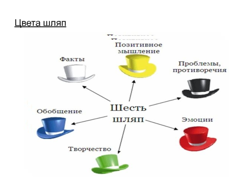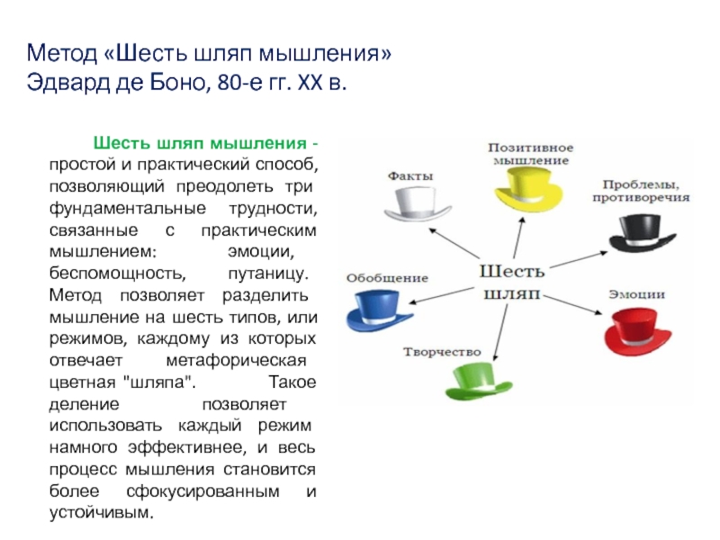 Шесть шляп мышления - простой и практический способ, позволяющий преодолеть три фундаментальные трудности, связанные с практическим мышлением: эмоции, беспомощность, путаницу. Метод позволяет разделить мышление на шесть типов, или режимов, каждому из которых отвечает метафорическая цветная "шляпа". Такое деление позволяет использовать каждый режим намного эффективнее, и весь процесс мышления становится более сфокусированным и устойчивым.