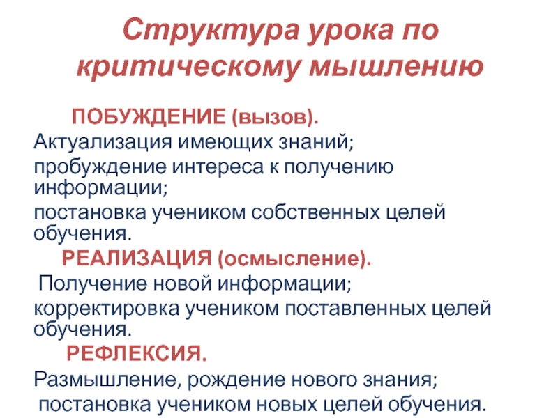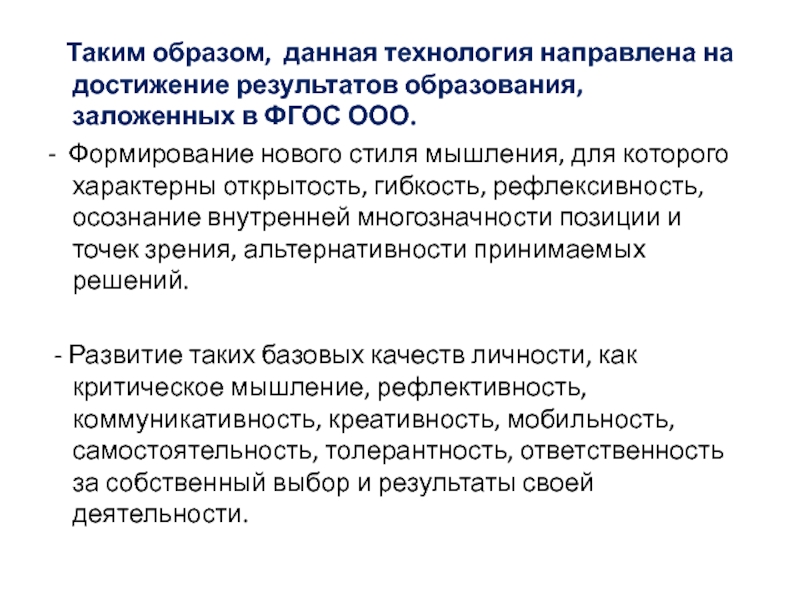 - Формирование нового стиля мышления, для которого характерны открытость, гибкость, рефлексивность, осознание внутренней многозначности позиции и точек зрения, альтернативности принимаемых решений.