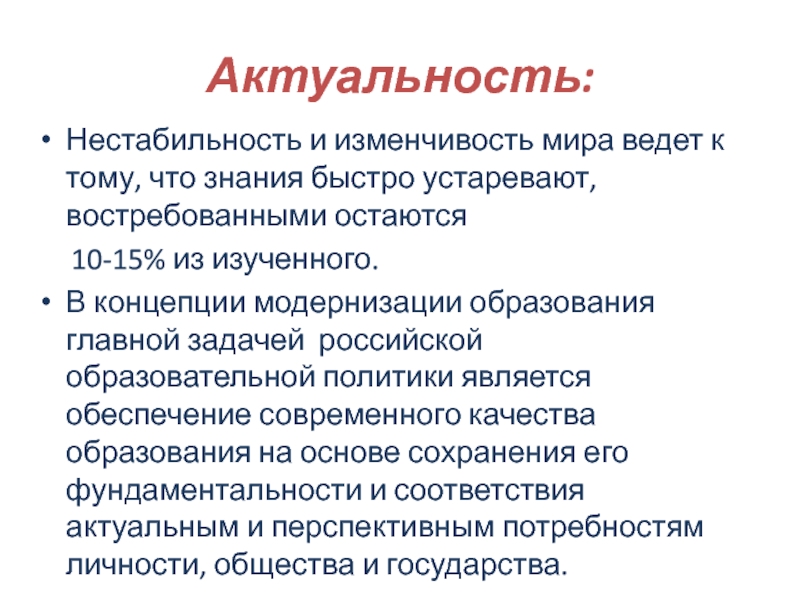 В концепции модернизации образования главной задачей российской образовательной политики является обеспечение современного качества образования на основе сохранения его фундаментальности и соответствия актуальным и перспективным потребностям личности, общества и государства.