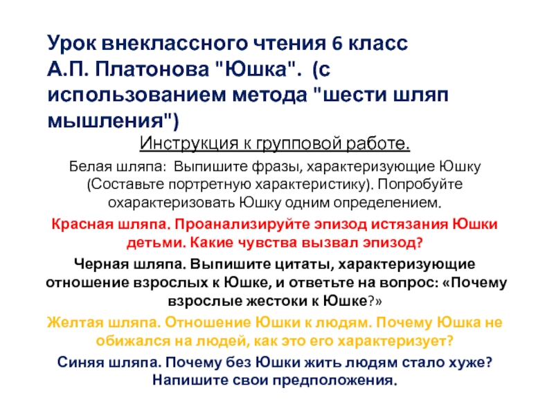 А.П. Платонова "Юшка". (с использованием метода "шести