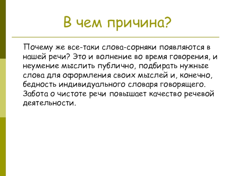 речи? Это и волнение во время говорения, и неумение мыслить публично, подбирать нужные слова для оформления своих мыслей и, конечно, бедность индивидуального словаря говорящего. Забота о чистоте речи повышает качество речевой деятельности.