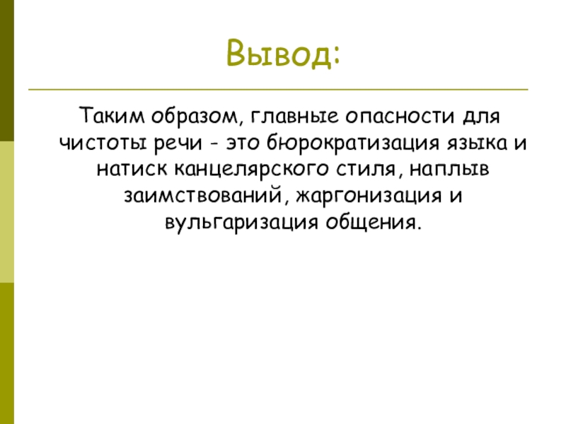Таким образом, главные опасности для чистоты речи - это бюрократизация