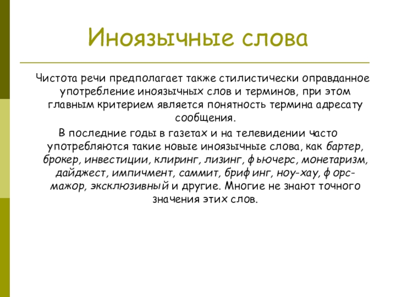 Чистота речи предполагает также стилистически оправданное употребление иноязычных