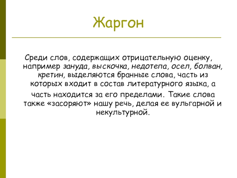 кретин, выделяются бранные слова, часть из которых входит в состав литературного языка, а часть находится за его пределами. Такие слова также «засоряют» нашу речь, делая ее вульгарной и некультурной.