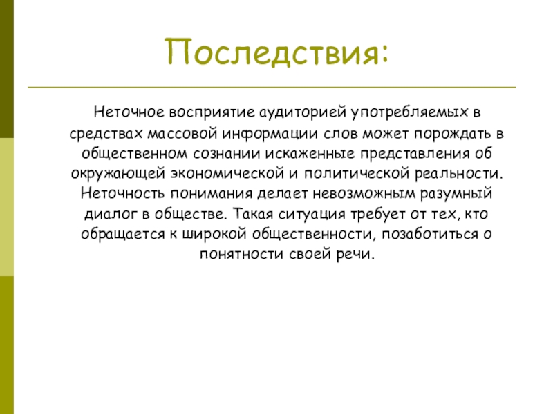 может порождать в общественном сознании искаженные представления об окружающей экономической и политической реальности. Неточность понимания делает невозможным разумный диалог в обществе. Такая ситуация требует от тех, кто обращается к широкой общественности, позаботиться о понятности своей речи.