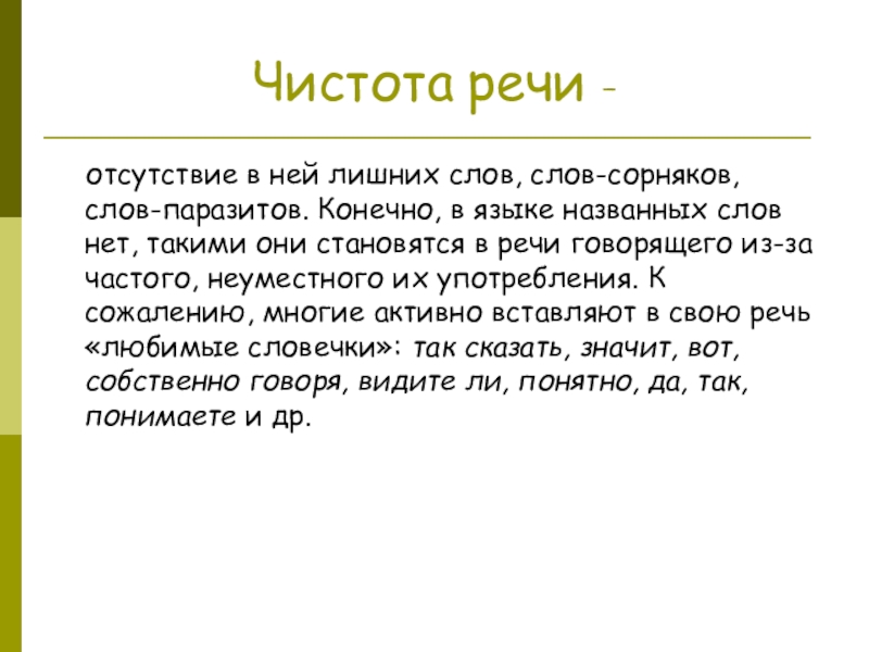 слов-паразитов. Конечно, в языке названных слов нет, такими они становятся в речи говорящего из-за частого, неуместного их употребления. К сожалению, многие активно вставляют в свою речь «любимые словечки»: так сказать, значит, вот, собственно говоря, видите ли, понятно, да, так, понимаете и др.