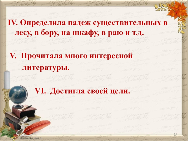 Слайд 25ІV. Определила падеж существительных в лесу, в бору, на шкафу, в