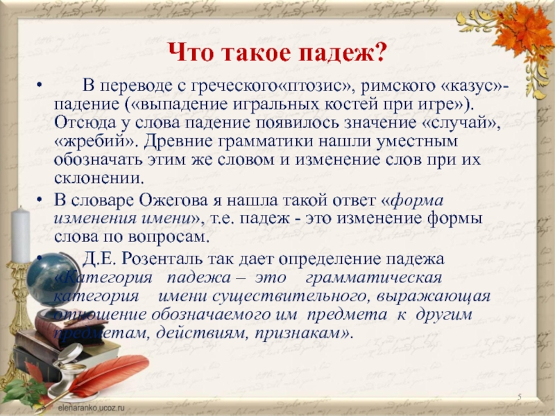 Д.Е. Розенталь так дает определение падежа «Категория падежа – это грамматическая категория имени существительного, выражающая отношение обозначаемого им предмета к другим предметам, действиям, признакам».