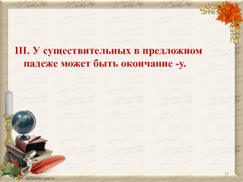 Слайд 24ІІІ. У существительных в предложном падеже может быть окончание -у.
