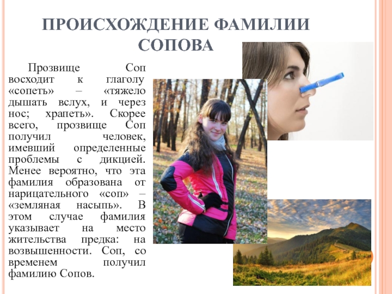 «тяжело дышать вслух, и через нос; храпеть». Скорее всего, прозвище Соп получил человек, имевший определенные проблемы с дикцией. Менее вероятно, что эта фамилия образована от нарицательного «соп» – «земляная насыпь». В этом случае фамилия указывает на место жительства предка: на возвышенности. Соп, со временем получил фамилию Сопов.