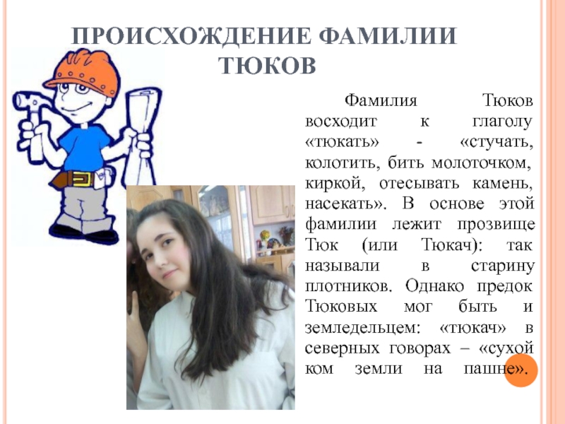 бить молоточком, киркой, отесывать камень, насекать». В основе этой фамилии лежит прозвище Тюк (или Тюкач): так называли в старину плотников. Однако предок Тюковых мог быть и земледельцем: «тюкач» в северных говорах – «сухой ком земли на пашне».