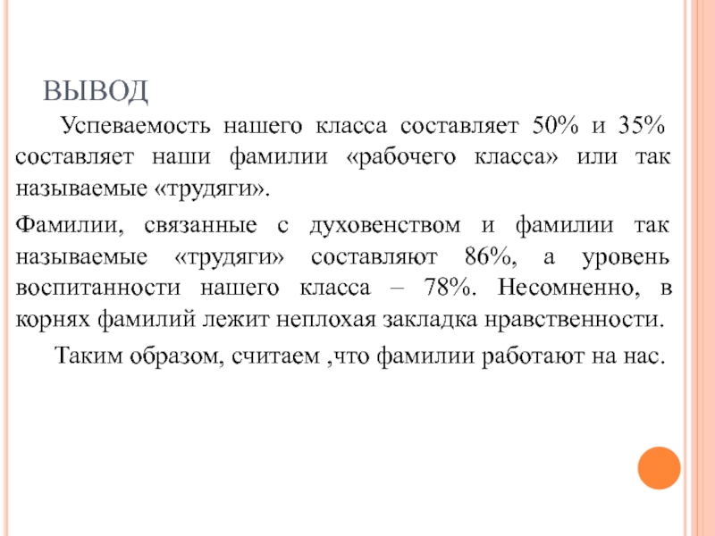 Фамилии, связанные с духовенством и фамилии так называемые «трудяги» составляют 86%, а уровень воспитанности нашего класса – 78%. Несомненно, в корнях фамилий лежит неплохая закладка нравственности.