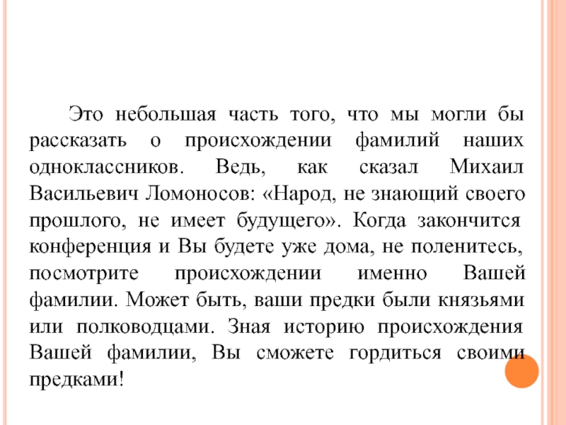 фамилий наших одноклассников. Ведь, как сказал Михаил Васильевич Ломоносов: «Народ, не знающий своего прошлого, не имеет будущего». Когда закончится конференция и Вы будете уже дома, не поленитесь, посмотрите происхождении именно Вашей фамилии. Может быть, ваши предки были князьями или полководцами. Зная историю происхождения Вашей фамилии, Вы сможете гордиться своими предками!