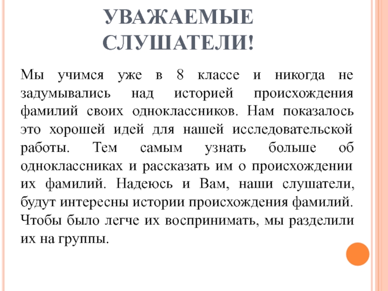 над историей происхождения фамилий своих одноклассников. Нам показалось это хорошей идей для нашей исследовательской работы. Тем самым узнать больше об одноклассниках и рассказать им о происхождении их фамилий. Надеюсь и Вам, наши слушатели, будут интересны истории происхождения фамилий. Чтобы было легче их воспринимать, мы разделили их на группы.