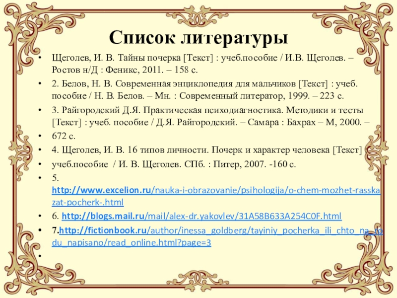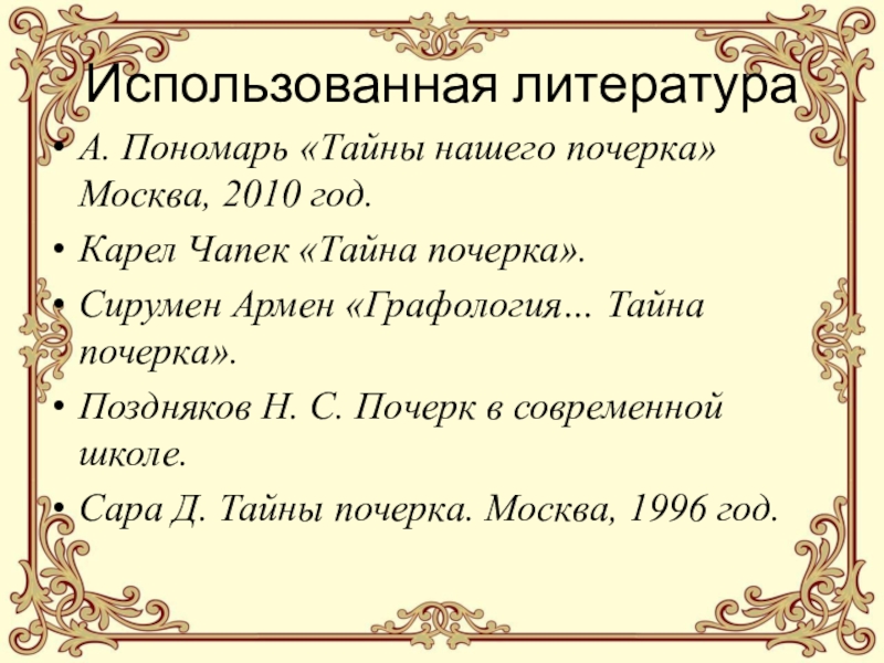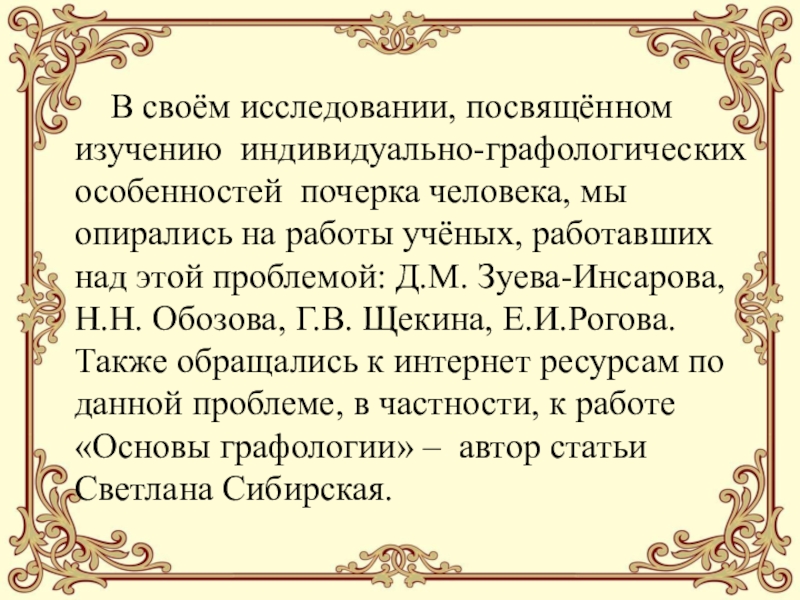 мы опирались на работы учёных, работавших над этой проблемой: Д.М. Зуева-Инсарова, Н.Н. Обозова, Г.В. Щекина, Е.И.Рогова. Также обращались к интернет ресурсам по данной проблеме, в частности, к работе «Основы графологии» – автор статьи Светлана Сибирская.