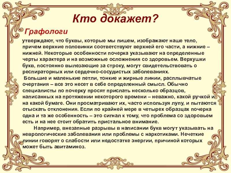 которые мы пишем, изображают наше тело, причем верхние половинки соответствуют верхней его части, а нижние – нижней. Некоторые особенности почерка указывают на определенные черты характера и на возможные осложнения со здоровьем. Верхушки букв, постоянно вылезающие за строку, могут свидетельствовать о респираторных или сердечно-сосудистых заболеваниях.