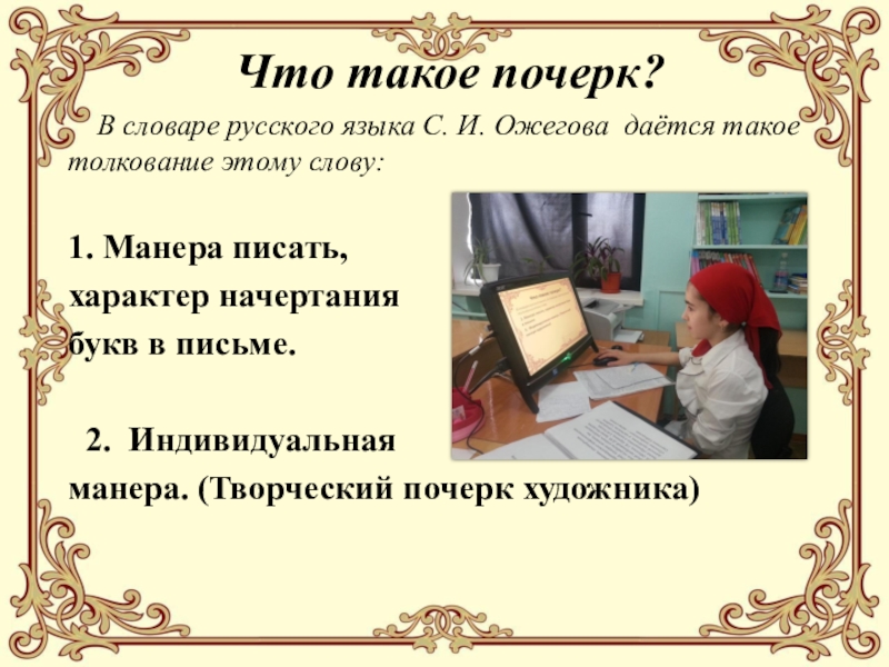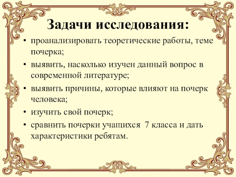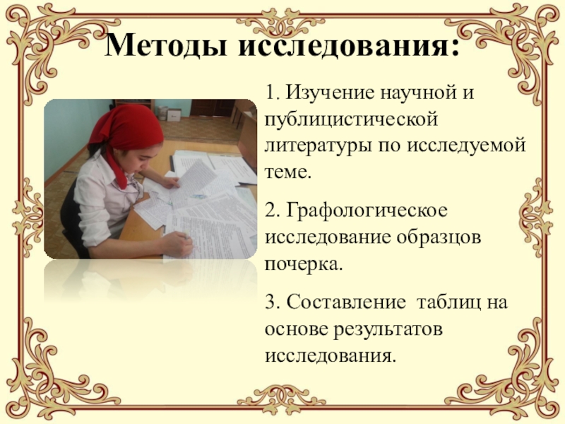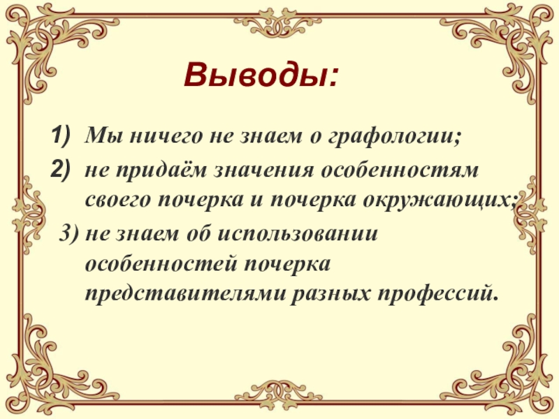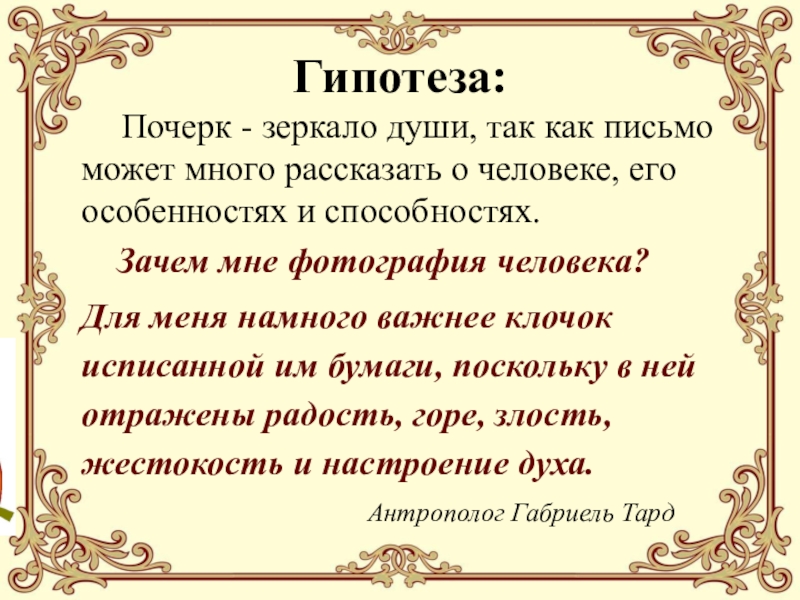 Слайд 9 В своём исследовании, посвящённом изучению индивидуально-графологических особенностей почерка человека,