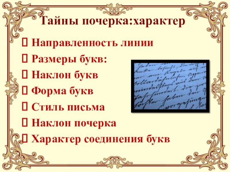 выражения. Подобно отпечатку пальцев или голосу, она уникальна для каждого человека. В почерке, как и в поведении, и в речи раскрывается внутренний мир человека.»