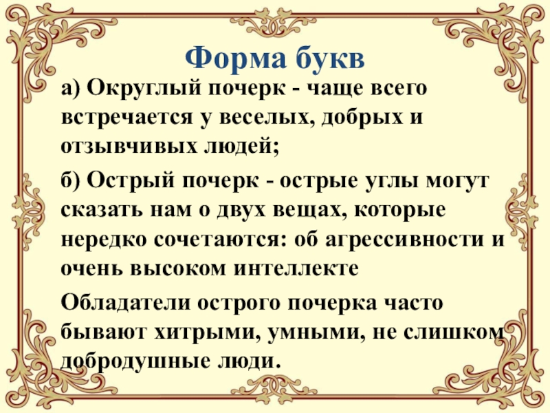 б) Острый почерк - острые углы могут сказать нам о двух вещах, которые нередко сочетаются: об агрессивности и очень высоком интеллекте