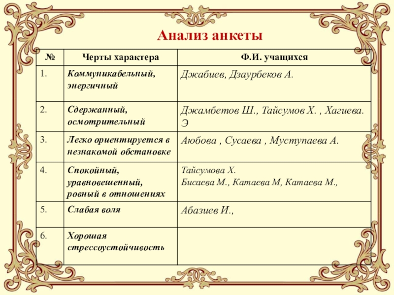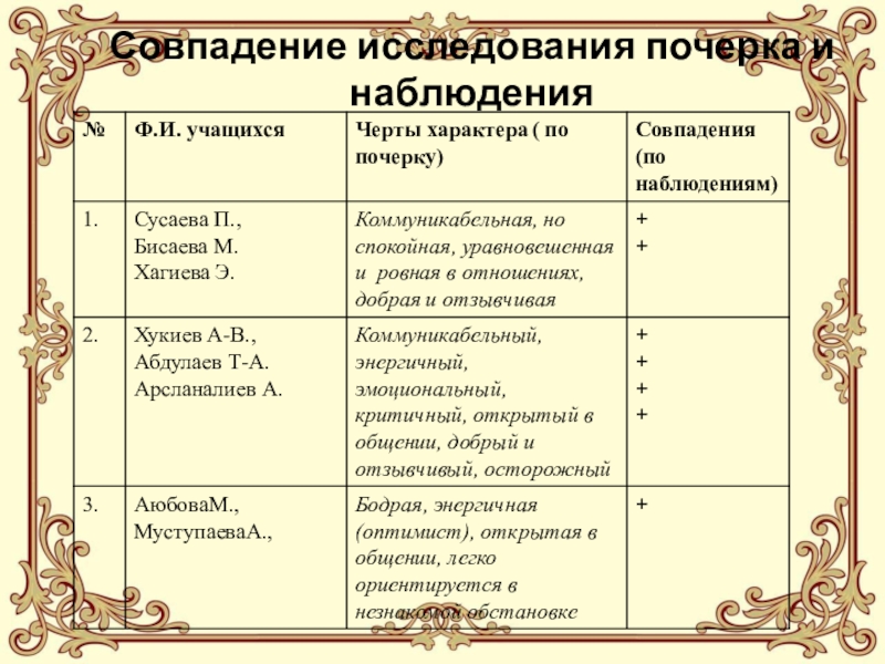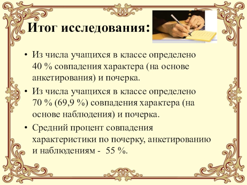 40 % совпадения характера (на основе анкетирования) и почерка.