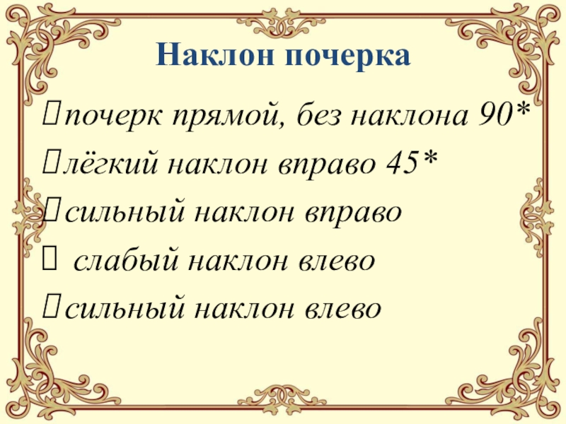в своей запиской книжке, другим пишет заявление о приеме на работу, третьим – дружеское поздравление. Однако для графолога эти почерки одинаковые. Изменяется лишь наклон, размер букв, качество их отделки, а внутреннее построение письма остается неизменным.