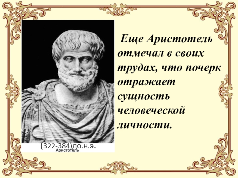 Слайд 16 Еще Аристотель отмечал в своих трудах, что почерк отражает сущность