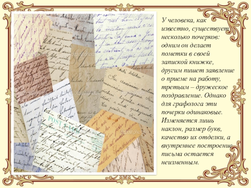 Слайд 20У человека, как известно, существует несколько почерков: одним он делает пометки