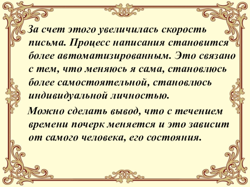 Слайд 24 За счет этого увеличилась скорость письма. Процесс написания становится