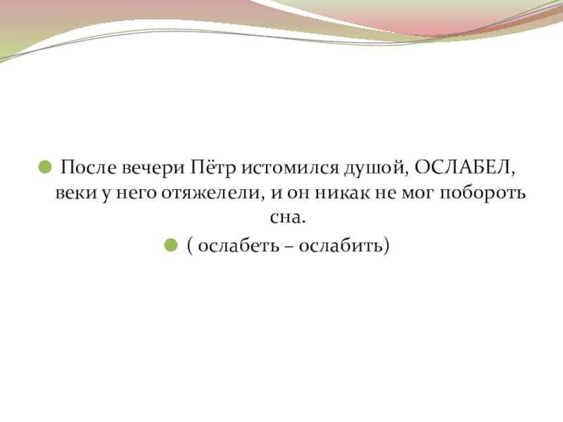 Слайд 24После вечери Пётр истомился душой, ОСЛАБЕЛ, веки у него отяжелели, и