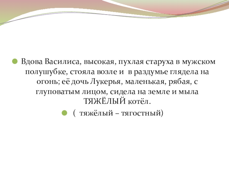 Слайд 25Вдова Василиса, высокая, пухлая старуха в мужском полушубке, стояла возле и