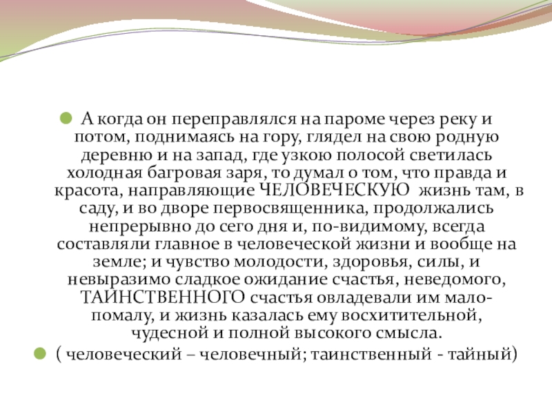 на гору, глядел на свою родную деревню и на запад, где узкою полосой светилась холодная багровая заря, то думал о том, что правда и красота, направляющие ЧЕЛОВЕЧЕСКУЮ жизнь там, в саду, и во дворе первосвященника, продолжались непрерывно до сего дня и, по-видимому, всегда составляли главное в человеческой жизни и вообще на земле; и чувство молодости, здоровья, силы, и невыразимо сладкое ожидание счастья, неведомого, ТАИНСТВЕННОГО счастья овладевали им мало-помалу, и жизнь казалась ему восхитительной, чудесной и полной высокого смысла.