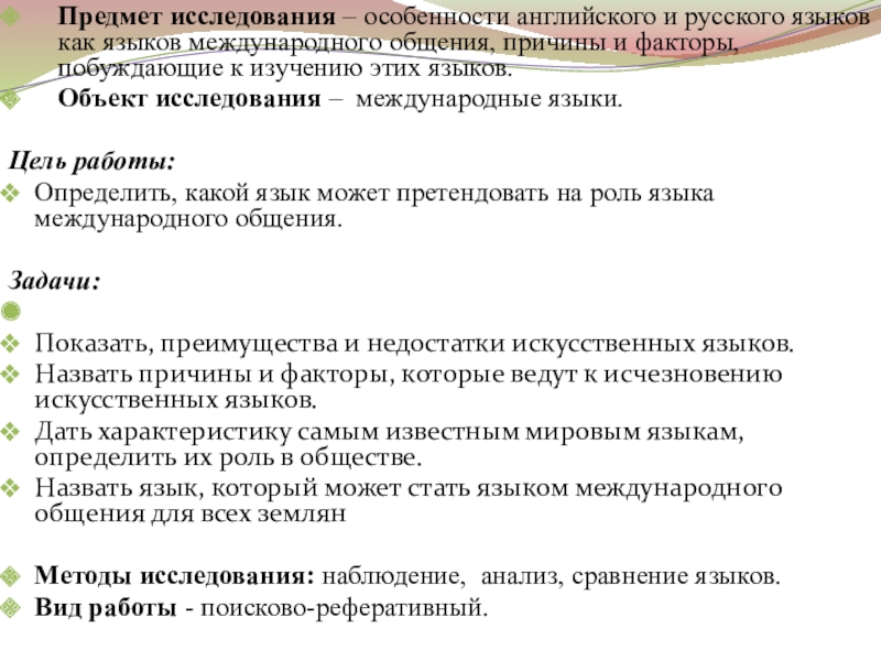 Слайд 3Предмет исследования – особенности английского и русского языков как языков международного