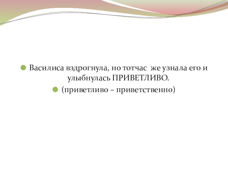 Слайд 22Василиса вздрогнула, но тотчас же узнала его и улыбнулась ПРИВЕТЛИВО.