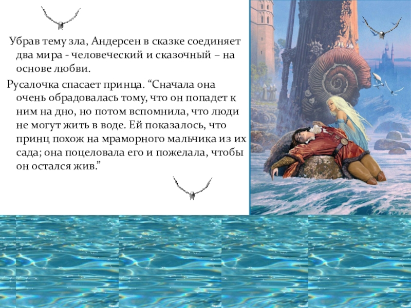 Русалочка спасает принца. “Сначала она очень обрадовалась тому, что он попадет к ним на дно, но потом вспомнила, что люди не могут жить в воде. Ей показалось, что принц похож на мраморного мальчика из их сада; она поцеловала его и пожелала, чтобы он остался жив.”