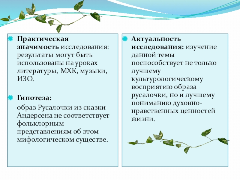 Актуальность исследования: изучение данной темы поспособствует не только лучшему культурологическому восприятию образа русалочки, но и лучшему пониманию духовно-нравственных ценностей жизни.