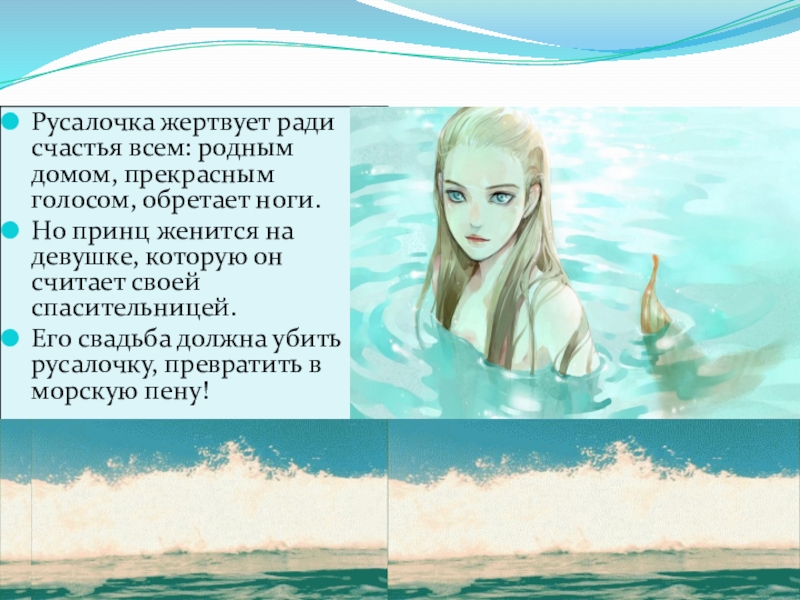 Слайд 22Русалочка жертвует ради счастья всем: родным домом, прекрасным голосом, обретает ноги.