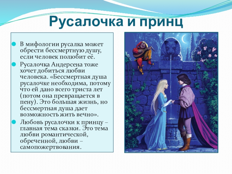 Любовь русалочки к принцу – главная тема сказки. Это тема любви романтической, обреченной, любви – самопожертвования.