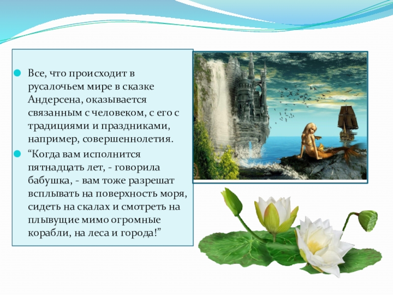 “Больше всего любила русалочка слушать рассказы о людях. Особенно удивляло русалочку то, что цветы на земле пахнут, что леса там зеленые, а рыбы, которые живут в ветвях, звонко поют. Бабушка называла рыбками птичек, иначе внучки не поняли бы ее”.