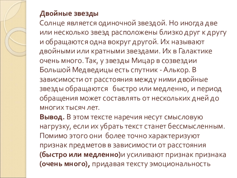 Вывод. В этом тексте наречия несут смысловую нагрузку, если их убрать текст станет бессмысленным. Помимо этого они более точно характеризуют признак предметов в зависимости от расстояния(быстро или медленно)и усиливают признак признака(очень много), придавая тексту эмоциональность