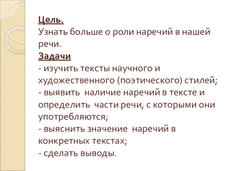 Работая с наречиями из текста стихотворения, у меня возник проблемный вопрос: « А какие части речи мы чаще всего используем в своей речи и во всех ли стилях речи используют наречия?» Интерес по этому вопросу у меня вызвал научный стиль.