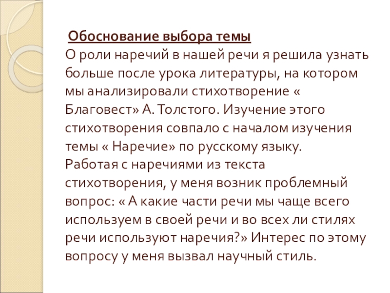 узнать больше после урока литературы, на котором мы анализировали стихотворение « Благовест» А. Толстого. Изучение этого стихотворения совпало с началом изучения темы « Наречие» по русскому языку.