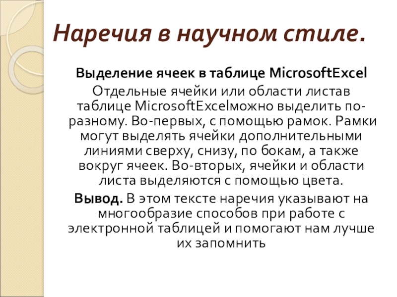 Вывод. В этом тексте наречия указывают на многообразие способов при работе с электронной таблицей и помогают нам лучше их запомнить