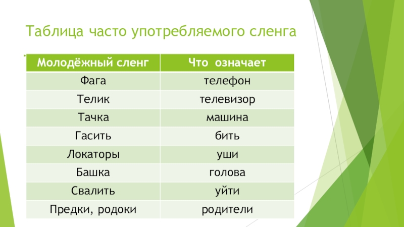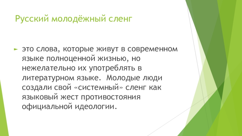 Русский молодёжный сленгэто слова, которые живут в современном языке полноценной жизнью, но нежелательно их употреблять в литературном