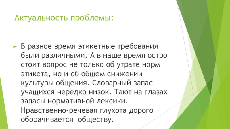 Актуальность проблемы:В разное время этикетные требования были различными. А в наше время остро стоит вопрос не только