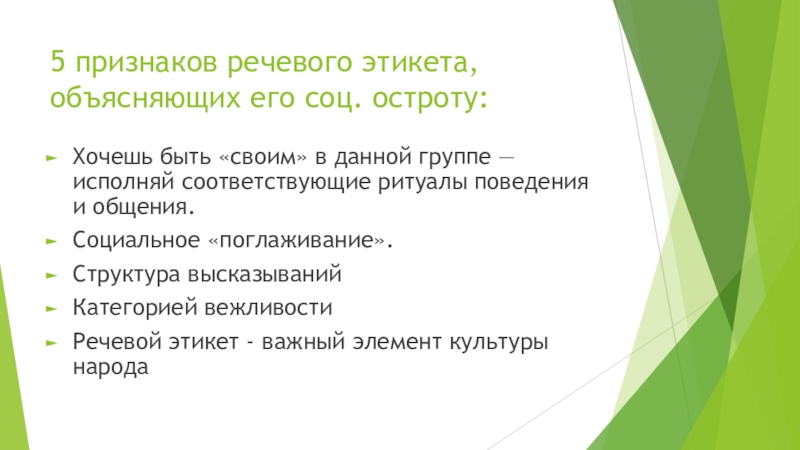 5 признаков речевого этикета, объясняющих его соц. остроту:Хочешь быть «своим» в данной группе —исполняй соответствующие ритуалы поведения