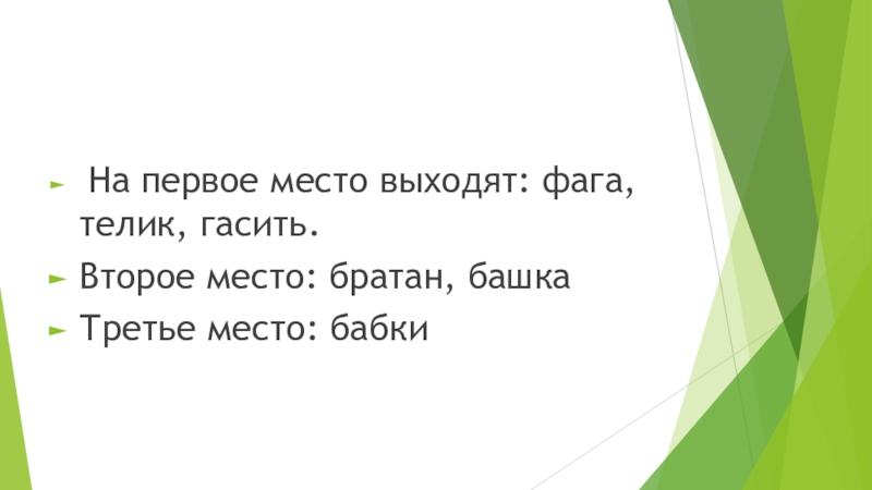 На первое место выходят: фага, телик, гасить.Второе место: братан, башкаТретье место: бабки