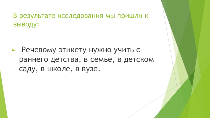 В результате исследования мы пришли к выводу:  Речевому этикету нужно учить с раннего детства, в семье,