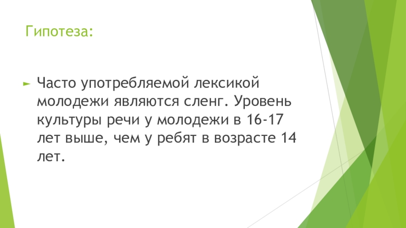 Гипотеза:Часто употребляемой лексикой молодежи являются сленг. Уровень культуры речи у молодежи в 16-17 лет выше, чем у ребят в возрасте 14 лет.