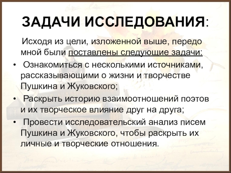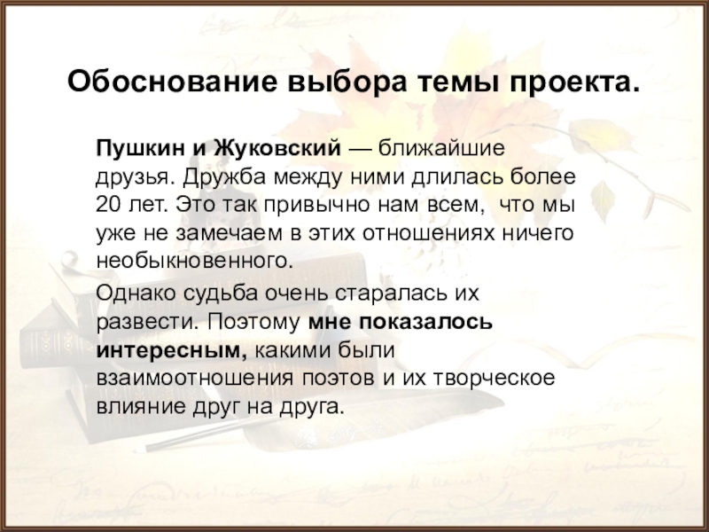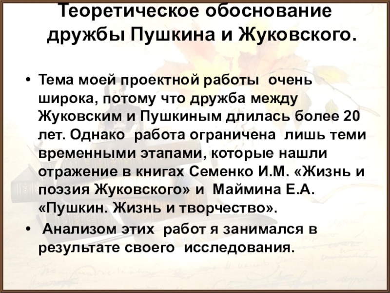 потому что дружба между Жуковским и Пушкиным длилась более 20 лет. Однако работа ограничена лишь теми временными этапами, которые нашли отражение в книгах Семенко И.М. «Жизнь и поэзия Жуковского» и Маймина Е.А. «Пушкин. Жизнь и творчество».
